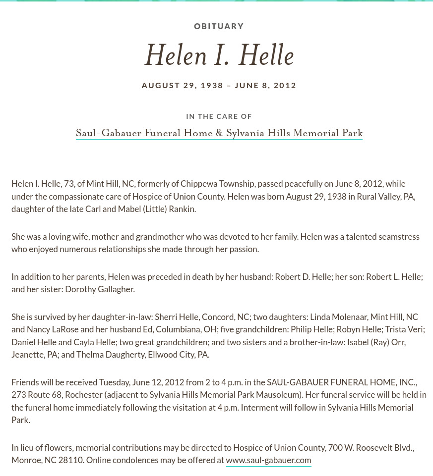 SourcesTitle: Helen I. HellePublication: Saul-Gabauer Funeral Home, Rochester, Beaver Co. PA, online obituaries, accessed 3 Jul 2024. URL: https://www.dignitymemorial.com/obituaries/rochester-pa/helen-helle-5133434 |
