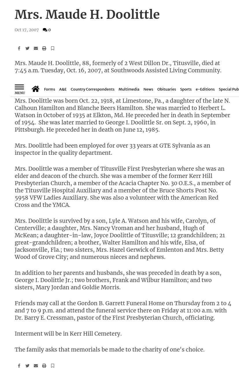 SourcesTitle: Obituary of Mrs. Maude H. DoolittlePublication: The Titusville Herald, Titusville, Crawford Co. PA, online obituaries, accessed 12 Aug 2021. URL: https://www.titusvilleherald.com/obituaries/article_d941076a-04b1-5854-86c4-9db80a77c43d.html |