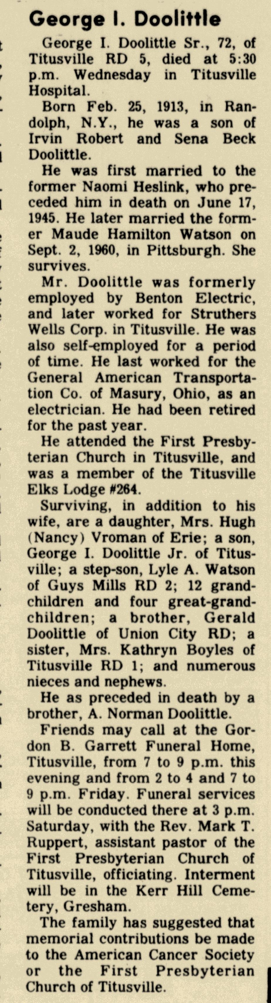George I. Doolittle, 72, of Titusville RD 5, died at 5:30 p.m. Wednesday in Titusville Hospital. Born Feb. 25, 1913, in Randoph, N.Y., he was a son of Irvin Robert and Sena Beck Doolittle. He as first married to the former Naomi Heslick, who preceded him in death on June 17, 1945. He laster married the former Maude Hamilton Watson on Sept. 2, 1960, in Pittsburgh. She survives ... Surviving in addtion to his wife are a daughter ... a son ... a step-son ... 12 grandchildren and four great-grandchildren; a brother ... a sister ... and numerous nieces and nephews. He was preceded in death by a brother, A. Norman Doolittle. ... Interment will be in the Kerr Hill Cemetery, Gresham. |